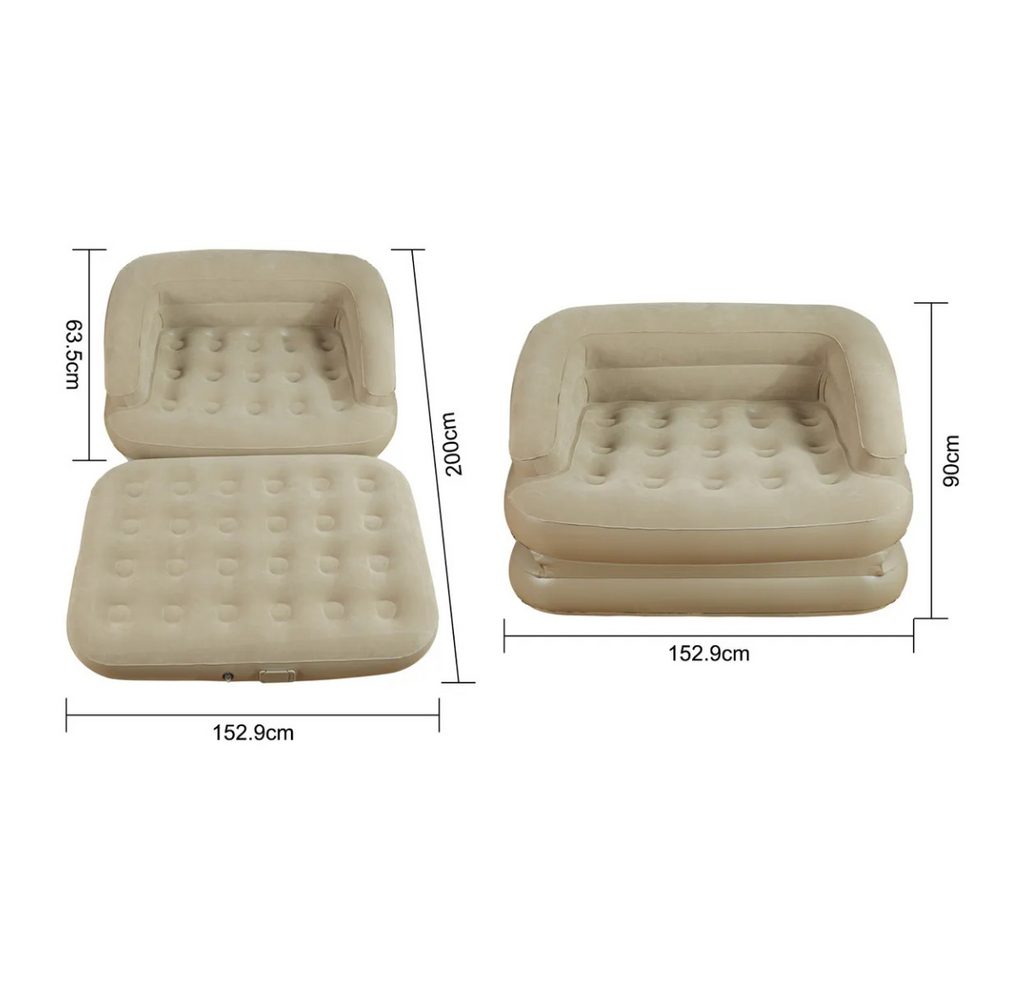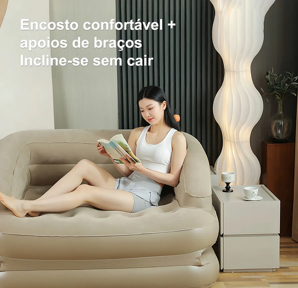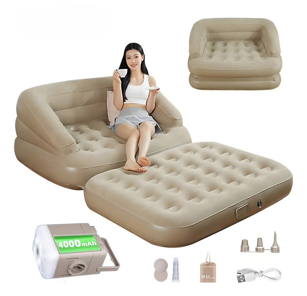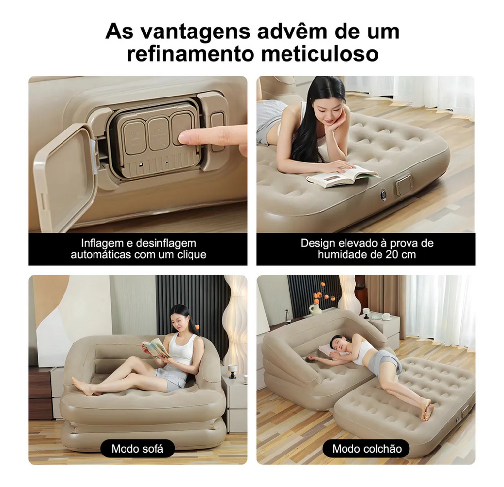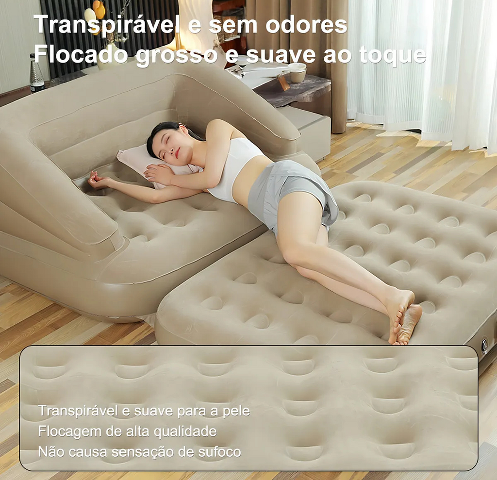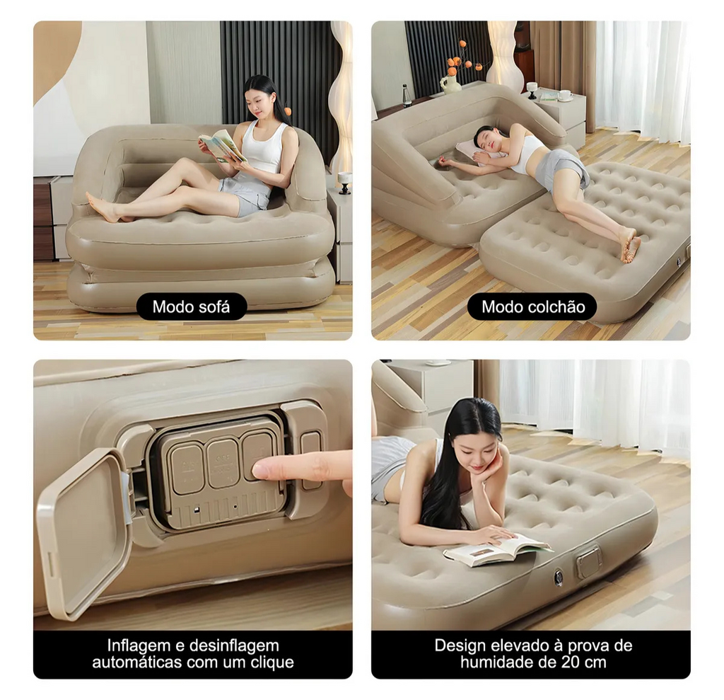 Este colchão inflável 2-em-1 (200×152 cm) alterna entre colchão e sofá com dobras simples. A bomba recarregável integrada enche em ~3 minutos — e também facilita o esvaziamento em um toque para guardar.